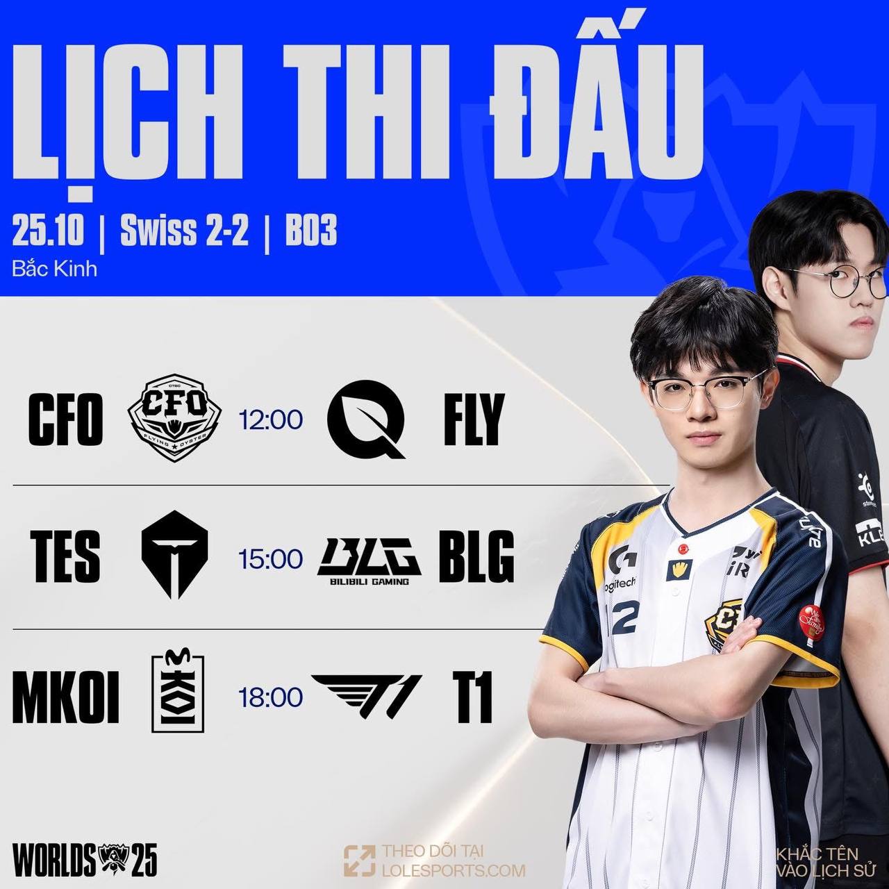 Vòng bảng CKTG 2025 đang bước vào giai đoạn căng thẳng nhất, và ngày 25/10 hứa hẹn sẽ là tâm điểm với ba cuộc đụng độ kinh điển: CFO vs FLY, BLG vs TES, và MKOI vs T1. Mỗi trận đấu đều mang ý nghĩa then chốt cho tấm vé đi tiếp, và chỉ một sai lầm nhỏ cũng có thể khiến giấc mơ vô địch tan vỡ.