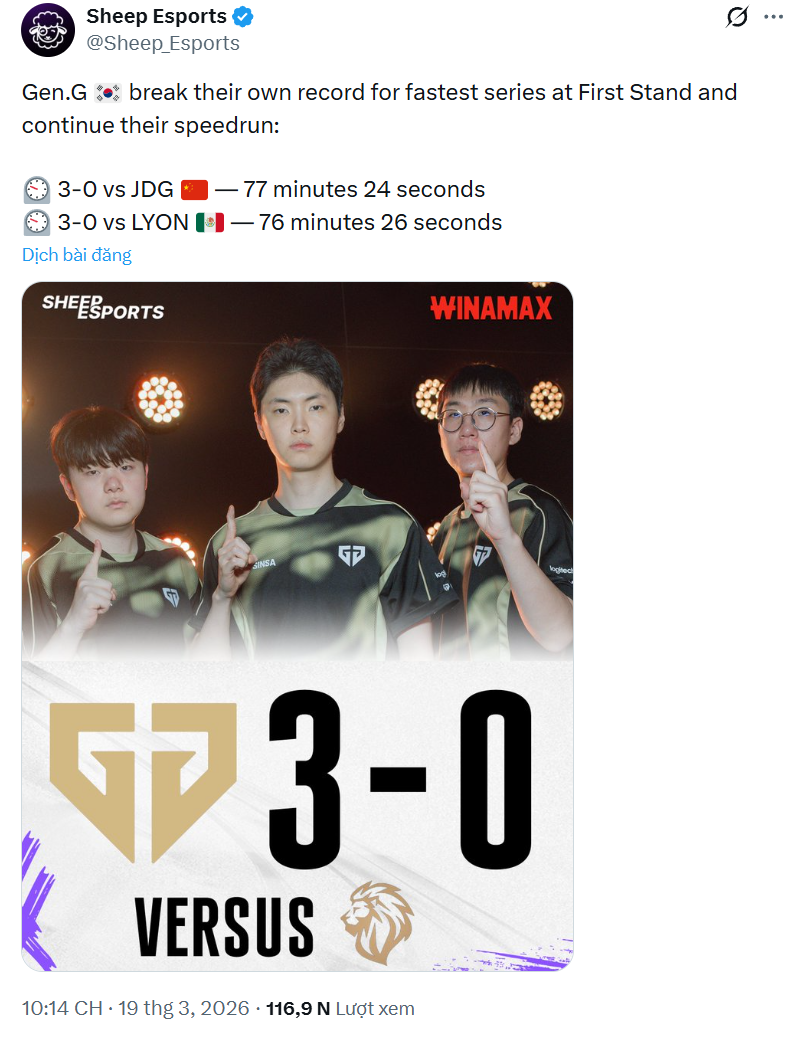 Trong những ngày qua, cộng đồng LMHT đang đổ dồn sự chú ý về First Stand 2026 và giải đấu quốc tế đầu tiên trong năm của Riot cũng đang dần đi đến hồi kết. Các ứng cử viên sáng giá nhất cho chức vô địch đã dần lộ diện và nổi bật nhất chắc chắn phải kể đến chính là Gen.G – đương kim vô địch LCK Cup 2026. Không chỉ thể hiện phong độ hủy diệt trước các đối thủ, mà Gen.G còn tự lập cho mình những kỷ lục về tổng thời lượng BO5 ngắn nhất First Stand, rồi chính họ cũng tự phá những kỷ lục đó luôn.
